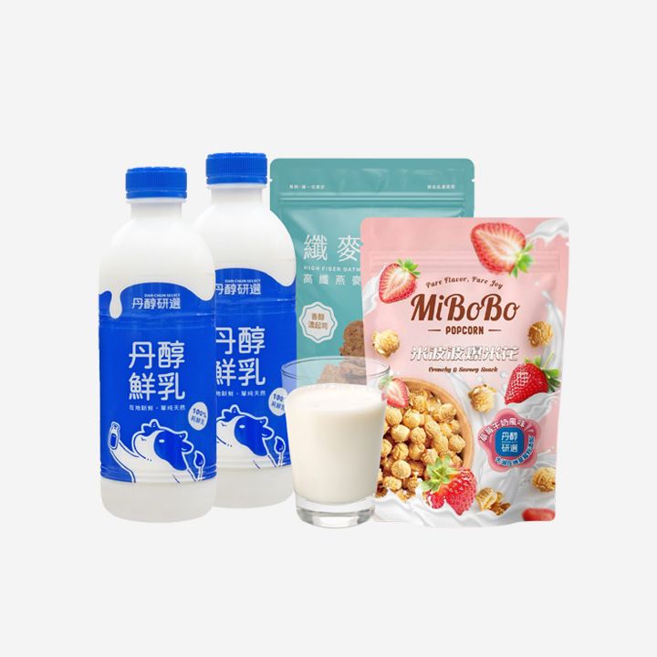 丹醇鮮乳930ml/瓶、高纖燕麥脆片150g、140g/包、爆米花100g/包